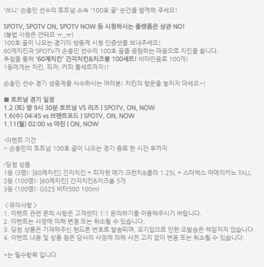 스포티비에서 100호골 경기 1시간 후까지 응모가 가능한 치킨쏘기 이벤트 역시 진행되었는데요. 혹시 응모하신분들 계신지 궁금하네요. 100호골의 희열과 치킨 피자까지 당첨되면 새해부터 기분 좋을것 같은데 당첨되신분들 계시다면 부럽고 축하드립니다 :)